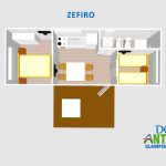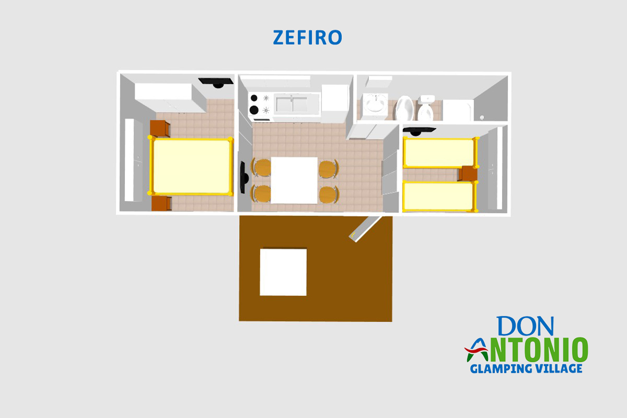 The Mobilhome Zefiro features one double bed and two single beds. It includes an entrance with kitchenette, Bluetooth sound system, fridge-freezer, sink, TV, bathroom with shower, bidet, washbasin, and toilet, air conditioning, and an outdoor veranda with one deck chair provided. Car parking is available 50 meters away.